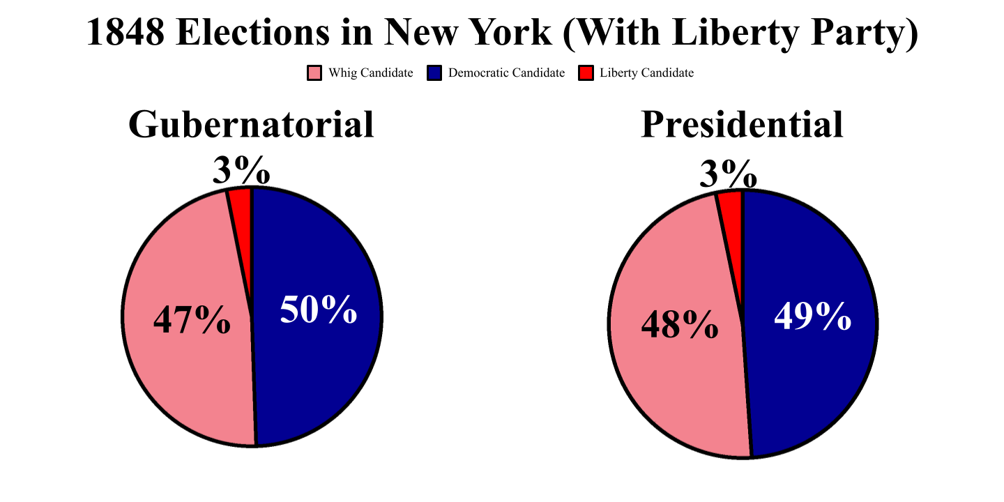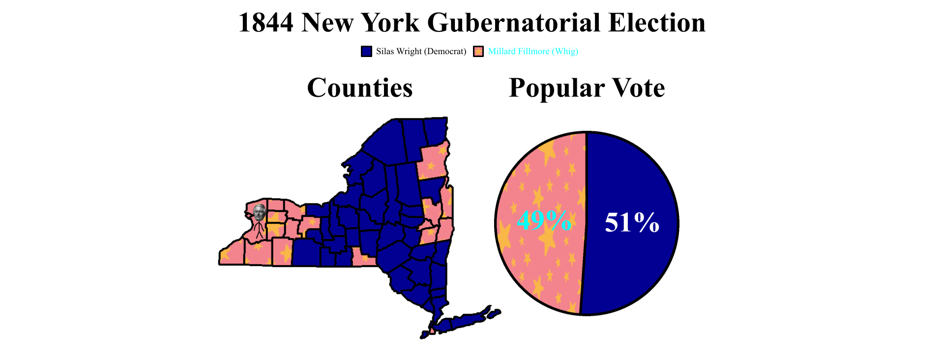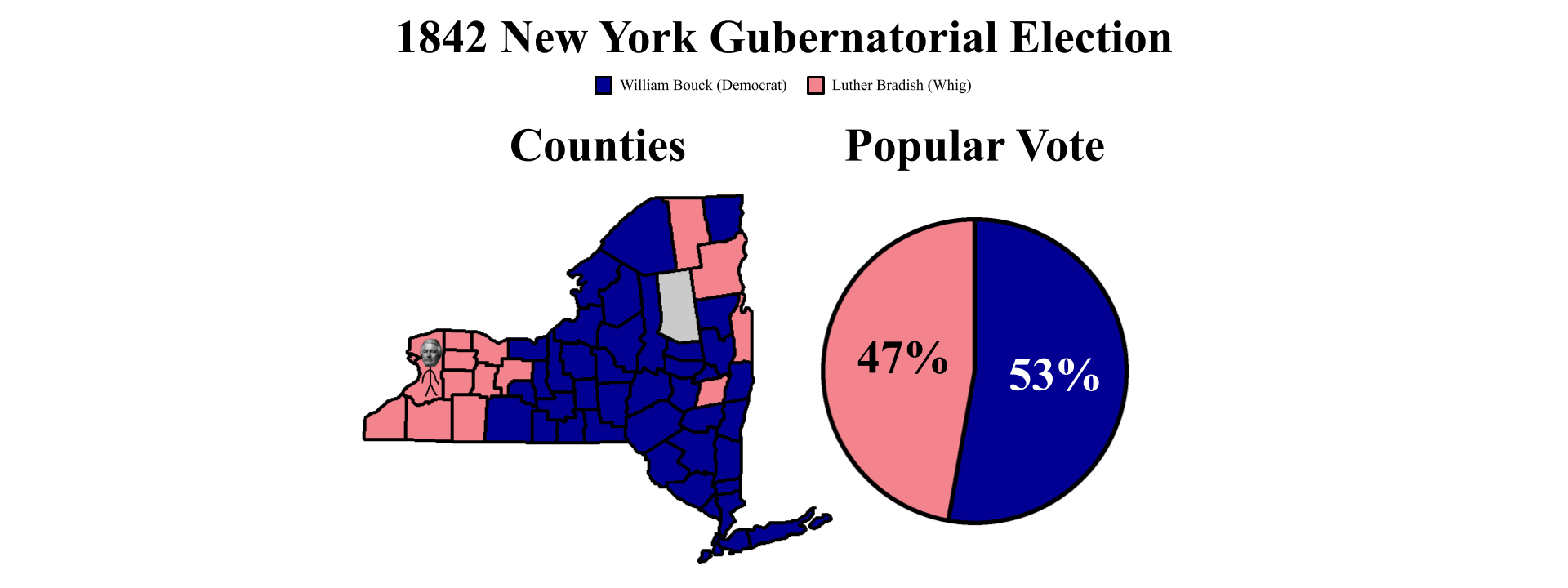 Meanwhile, Seward was having a rough time as governor of New York. When Virginia tried extraditing some people in New York who had aided in the escape of a slave, Seward refused. This pissed off Virginia, and its legislature retaliated with new restrictions on ships trading between Virginia and New York, which angered New York merchants. Worst of all, Seward had approved a lot of canal enlargements, which ended up having a much higher cost than was initially expected. This ended up giving New York a huge amount of debt. Due to his governorship not going well, Seward refused to seek a third term. Instead, Luther Bradish was the Whig nominee. Unfortunately for the Whigs, he wasn't able to pull off a win.