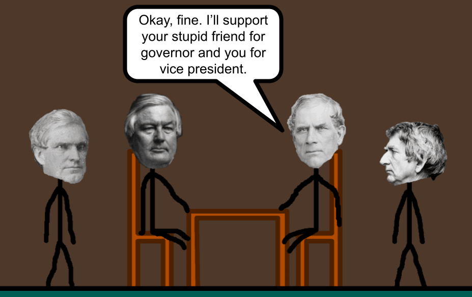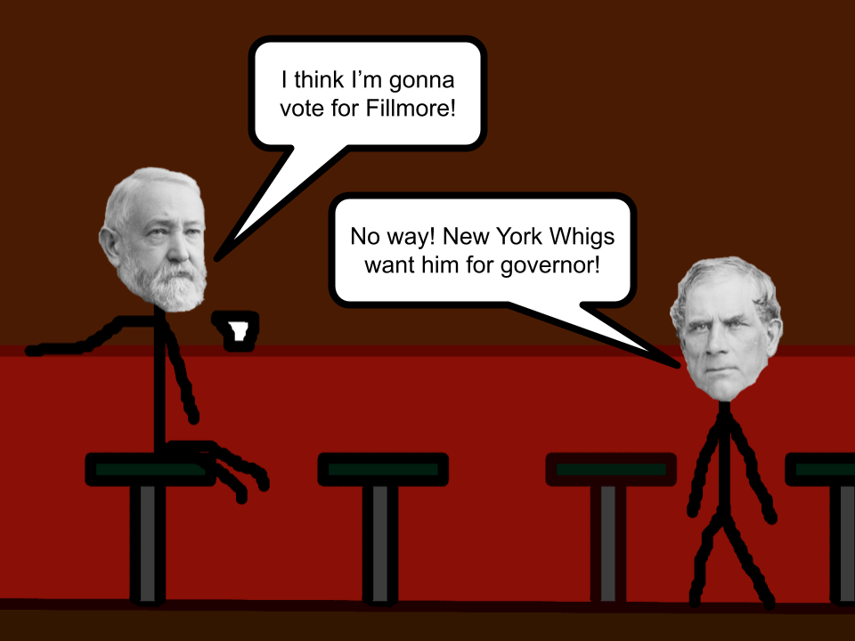 Weed asked Fillmore to run for governor one last time, but Fillmore refused. Weed now had a new plan: he would have to ensure Fillmore lost the vice presidential nomination, forcing him to run for governor instead. In May of 1844, the Whig national convention was being held in Baltimore. Fillmore did not attend, but Weed did. So once he got there, he told all the people from the other states that the New York Whigs would be happy if Fillmore was not nominated for Vice President since they wanted him as Governor. How evil.