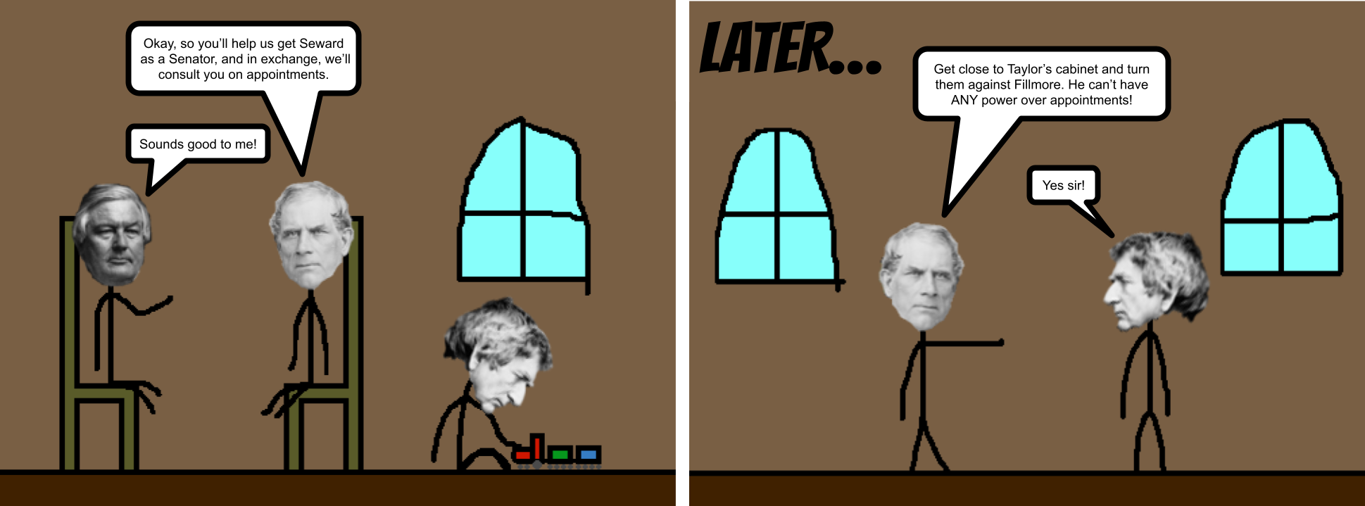 It may seem like they were all best friends now, but no. Weed still wanted to hurt Fillmore, so he secretly told Seward to ensure Fillmore would have no control over any appointments in New York. He also told him to try and get Taylor away from Southern influence. Seward's plan was to influence Taylor by befriending his cabinet members. Unfortunately for Fillmore, Taylor did not consult him when choosing his cabinet, giving him little influence over Taylor's cabinet.